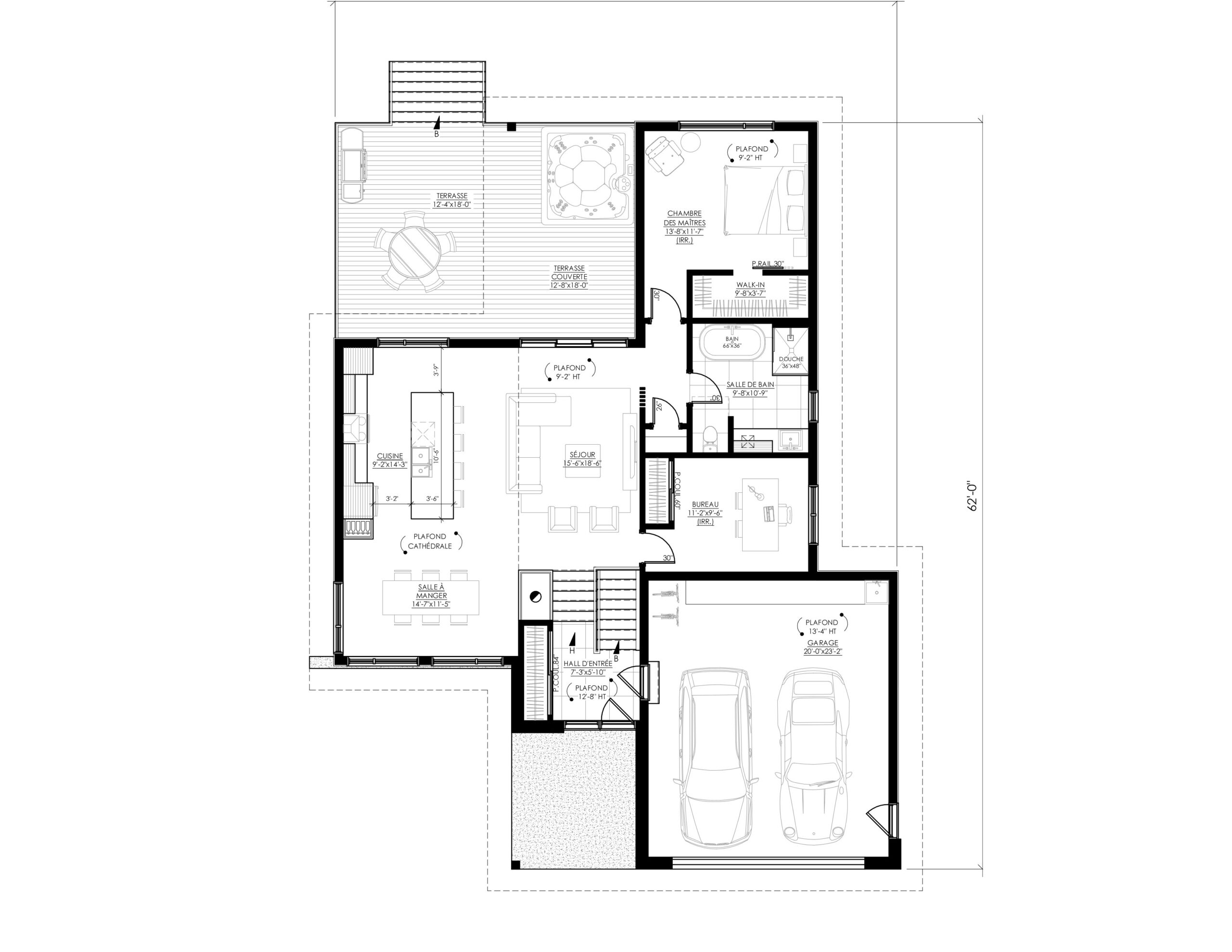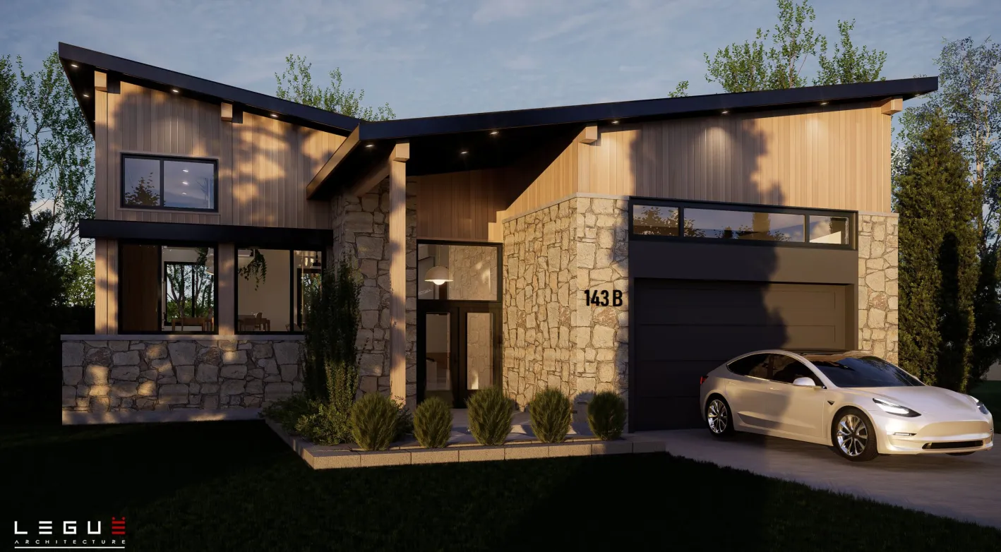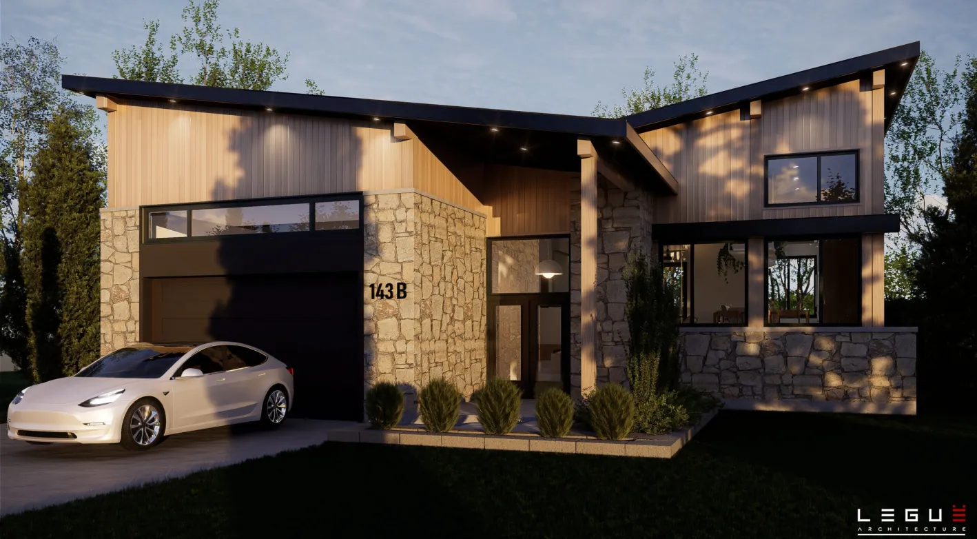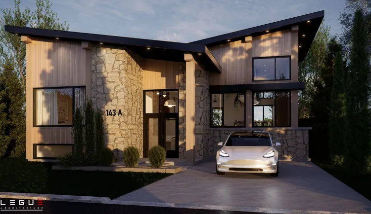 Le plan Ë_143 marie un style rustique et contemporain qui s’intègre à merveille dans les secteurs boisés ou en pleine nature. Ce concept plain-pied propose une aire ouverte pour les pièces de vie, salle de bain complète et deux chambres, dont celle des maîtres avec un grand walk-in. Le sous-sol pourra quant à lui être aménagé selon vos besoins. Deux ou trois chambres supplémentaires peuvent y être prévues.