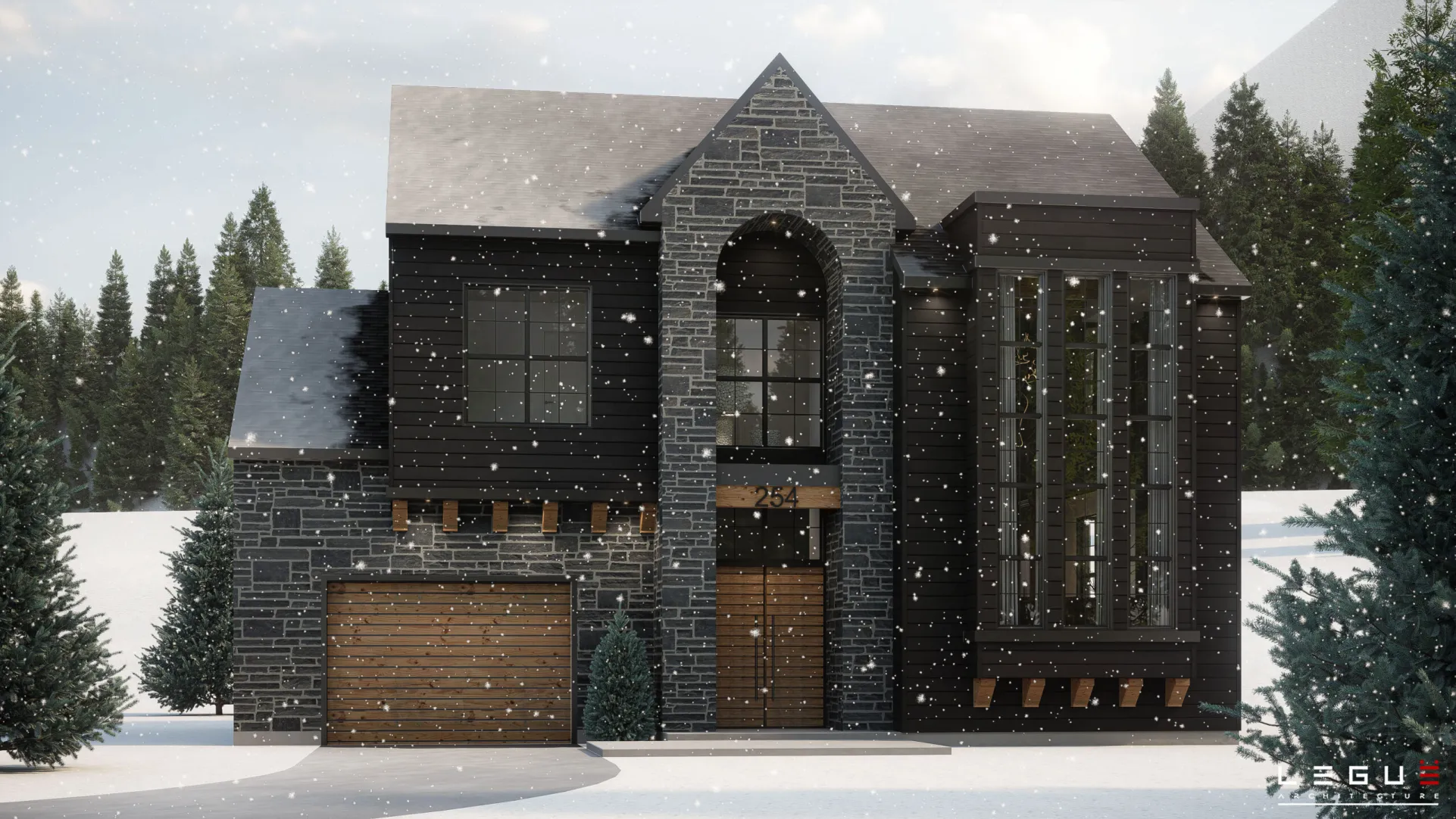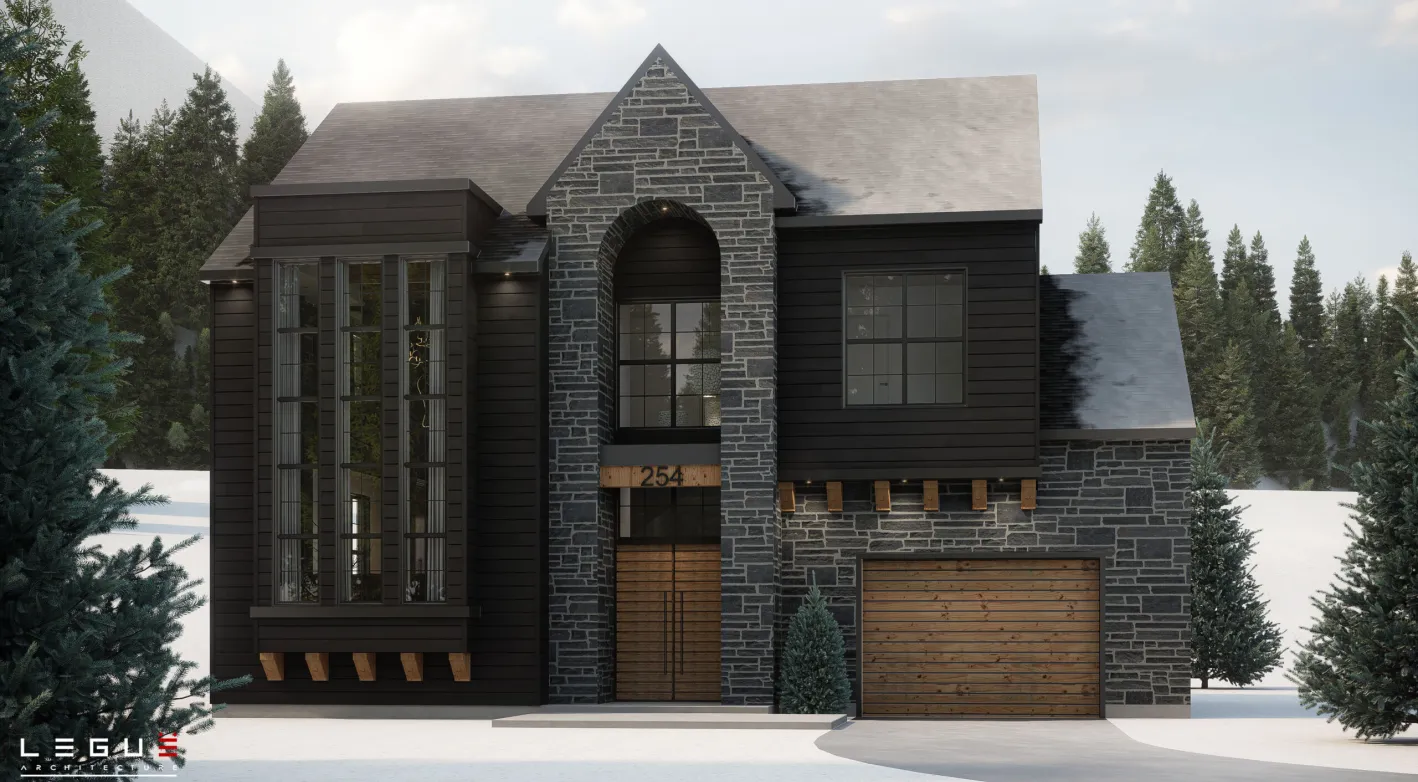 Le plan Ë_254 est un plan de chalet contemporain polyvalent pouvant être construit comme résidence principale ou chalet familial au Québec. Conçu sur deux niveaux avec sous-sol, ce plan de maison moderne offre de vastes aires de vie lumineuses, un hall d’entrée à double hauteur et une cuisine distinctive avec double îlot et arrière-cuisine, idéale pour recevoir. Grâce à sa grande fenestration et à son architecture chaleureuse inspirée des chalets québécois, le Ë_254 propose également une suite des maîtres spacieuse à l’étage et une conception fonctionnelle adaptée au climat et au mode de vie québécois.